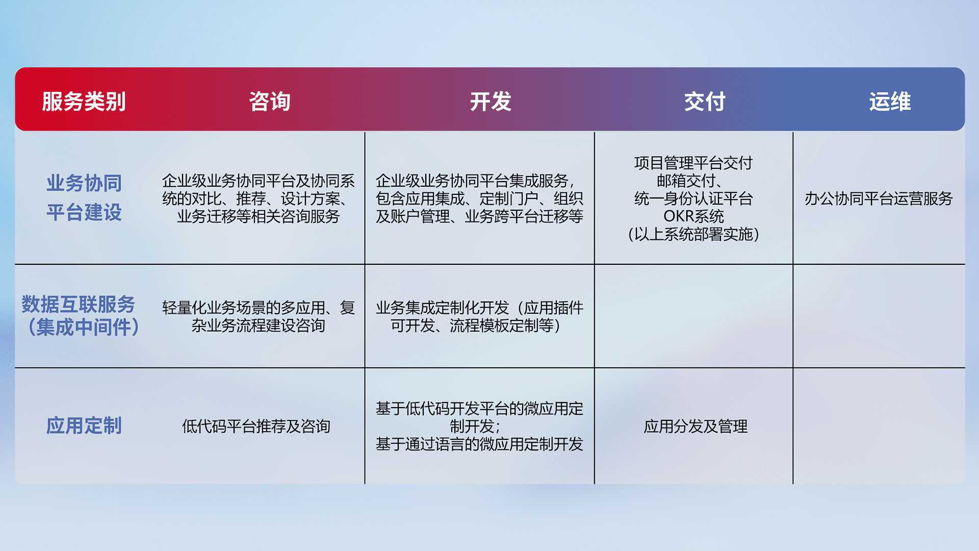 针对钉钉、、、、企微、、IDaas等平台级产品提供产品的规划、、、方案、、交付、、定制化开发等服务,,,,实现如统一协同办公、、、智能客户服务、、混合会议管理、、、智能数据查询、、、等业务场景,,实现数字化转型。。。。
