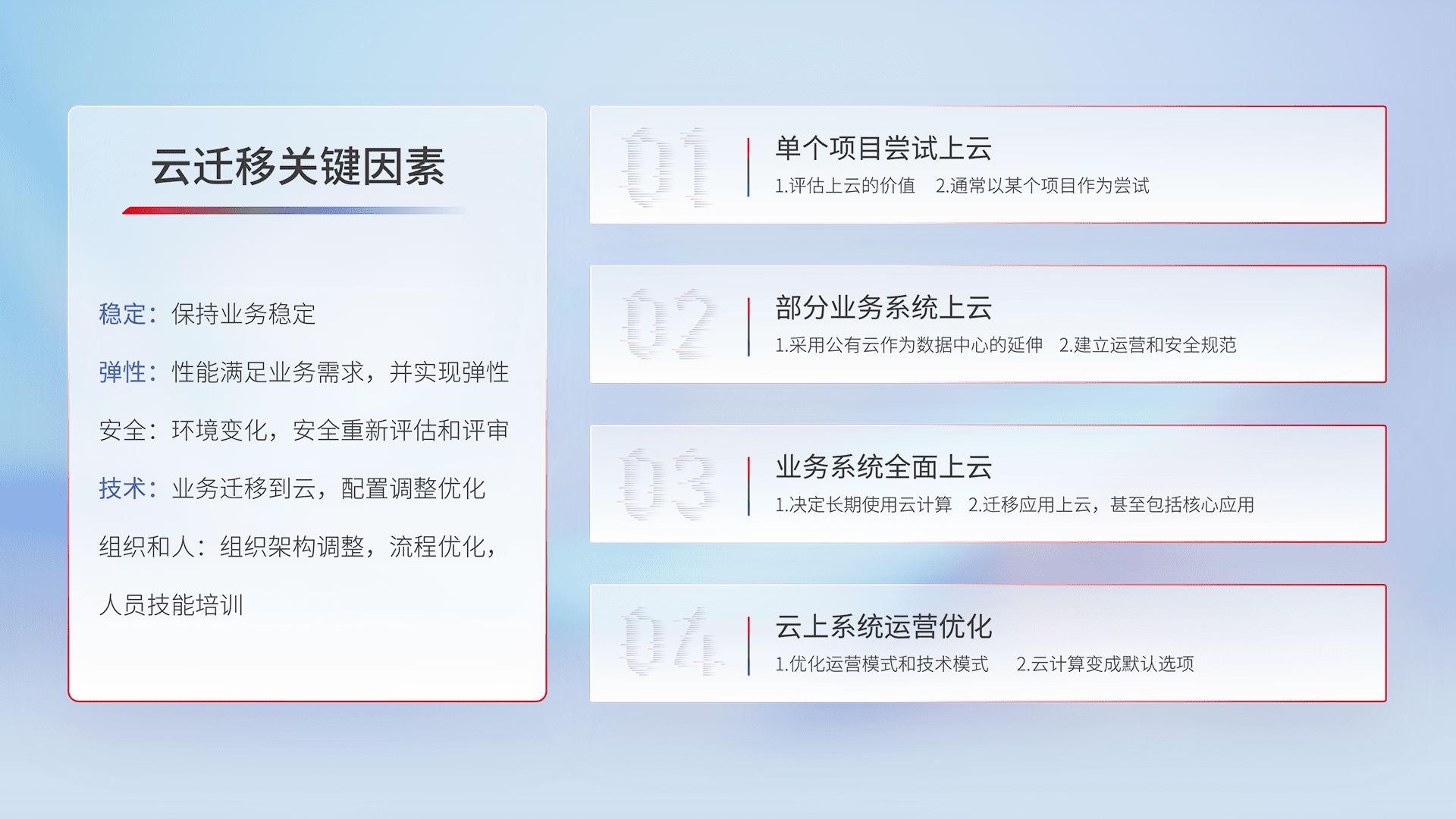 结合实际业务,,,,从规划设计、、、云平台选型、、、、云原生改造、、、、数据迁移、、、、集成交付,,迁移全过程为客户识别最佳上云路径,,做好风险识别管理,,,设计网络架构、、、、身份权限、、、、安全审计合规、、、操作审计、、、、日志审计、、监控告警策略、、多站点容灾设计等,,对云上基础设施进行整体规划,,提升IT治理水平,,,,以满足弹性、、高可用、、、高性能的需求。。。。