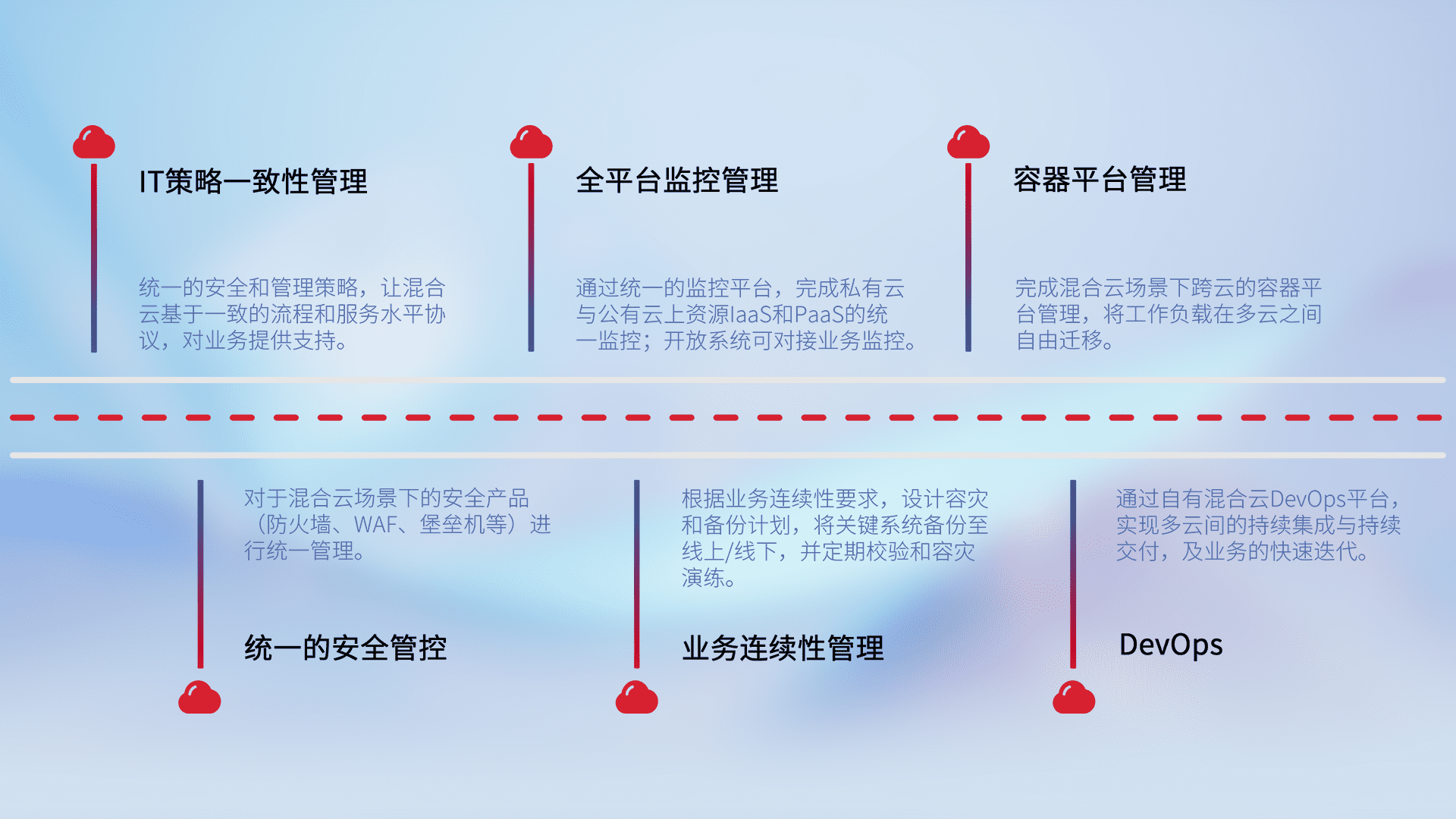 通过多云纳管,,以统一的资源数据模型把客户的云资源进行抽象和封装,,,,进而实现对多云资源的统一操作,,保障云资源管理的可靠性、、、稳定性与可用性。。。。量身定制化运维内容,,,,配置、、、、开发运维、、、、补丁管理、、备份、、、、监控、、、、认证和访问管理、、、审计和日常巡检等,,,保障在用云过程中的可靠度,,,,稳定度以及高可用率。。。。